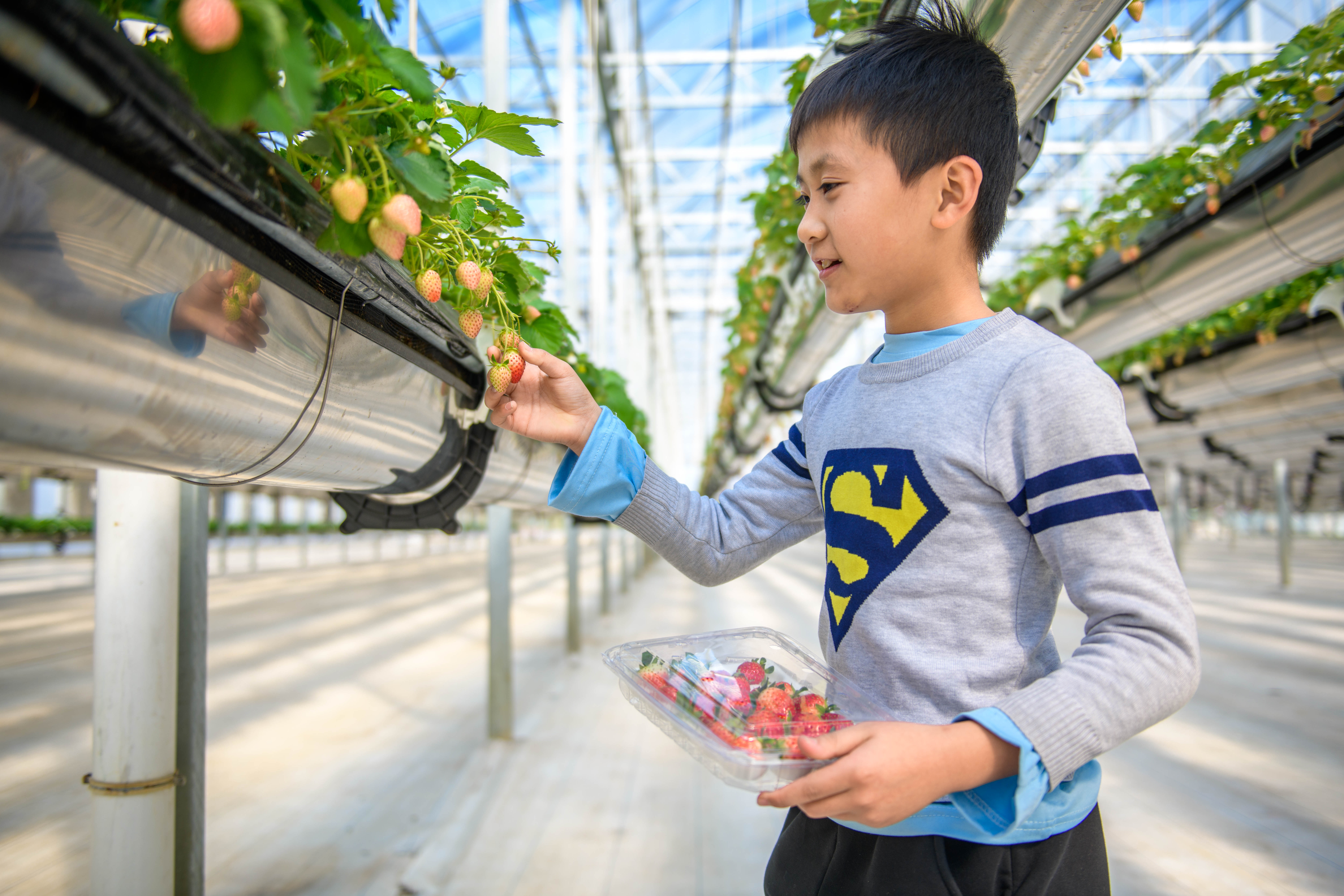 可升降的装置让孩子也可以轻松摘到草莓