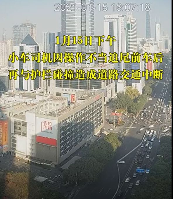 1月15日下午四时,福田区深南华强路口西往东西面发生一起两辆小车追尾事故,其中一辆小车将中间护栏撞至东往西方向,导致深南中路东往西方向断流。