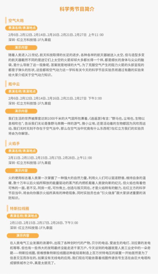 而在龙岗的文化地标——深圳红立方,不仅能感受国际一流的建筑空间和高端前卫的科技体验,还能带娃体验科技的魅力,当一个小小科学家!据悉,在2月份春节期间,红立方将推出4个科学秀节目,科学节目实验员将现场做出实验,近距离体验科学的神奇魅力。带娃的市民,也不妨来这走一走,为孩子的小小世界点亮科学的光芒!
