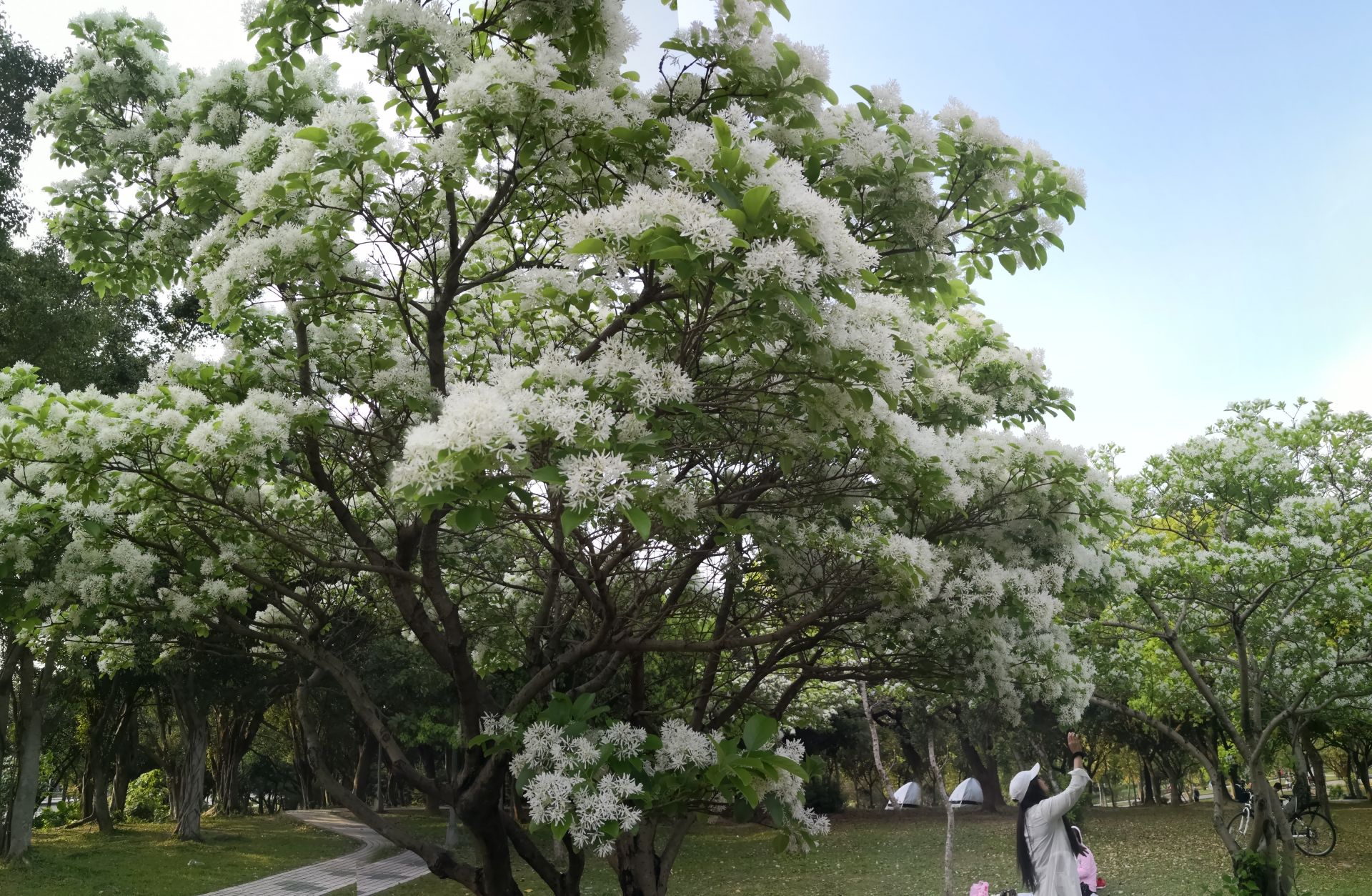 有“四月雪”之称的流苏花,在台北已进入花期尾声,大安森林公园、新中公园等是流苏的赏花秘境,一排排雪色满树的细密花朵壮观盛开,与前期旺开的紫藤花相映,紫紫白白绚丽异常。
