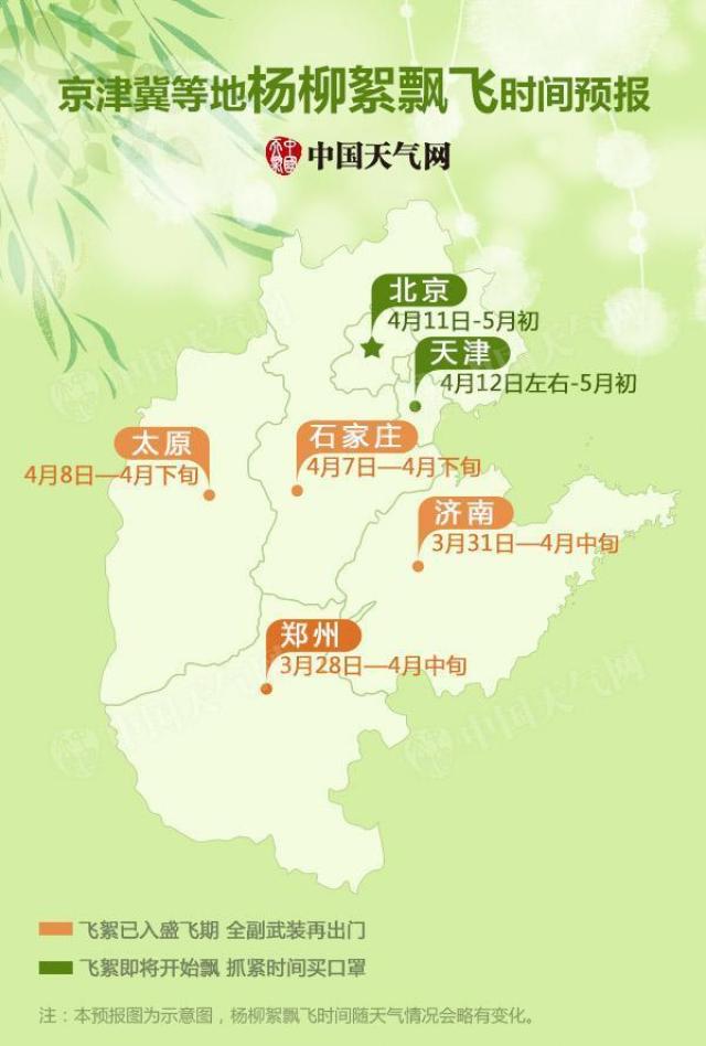 由于济南、郑州、石家庄等地纬度偏南,气温更高,所以飞絮日子比北京早。石家庄的飞絮在4月9日进入盛飞期,济南、郑州等地清明节前后也开始飞絮。