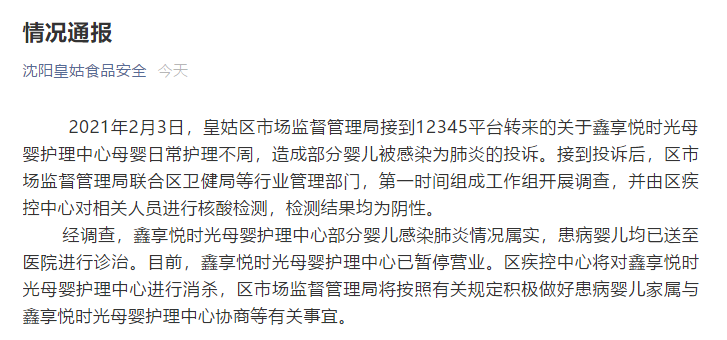 2021年2月3日,皇姑区市场监督管理局接到12345平台转来的关于鑫享悦时光母婴护理中心母婴日常护理不周,造成部分婴儿被感染为肺炎的投诉。接到投诉后,区市场监督管理局联合区卫健局等行业管理部门,第一时间组成工作组开展调查,并由区疾控中心对相关人员进行核酸检测,检测结果均为阴性。