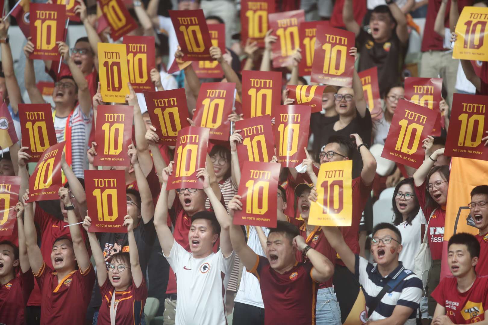 与其说这是一场球赛,不如说是一场演出更加贴切。托蒂的球迷在看台上组成了最整齐的方阵,高举着枣红色和黄色的“10”号,至始至终都在高呼着偶像的名字。直到比赛结束,托蒂才向南看台上的这群人挥了挥手,南看台一阵狂欢,对他们来说,这一次挥手,足以回报自己90分钟的付出。