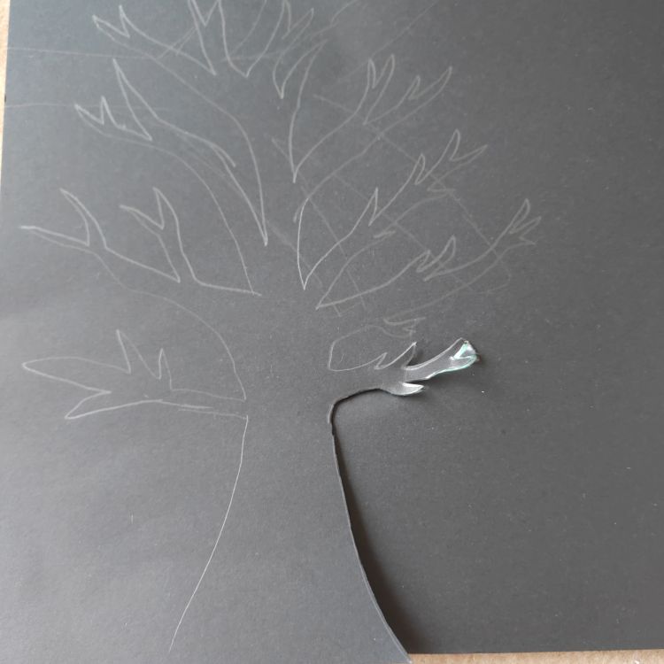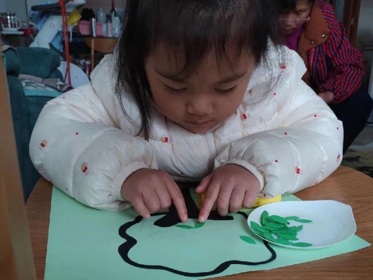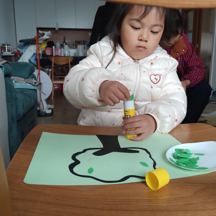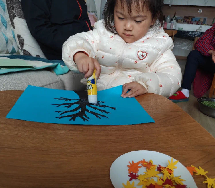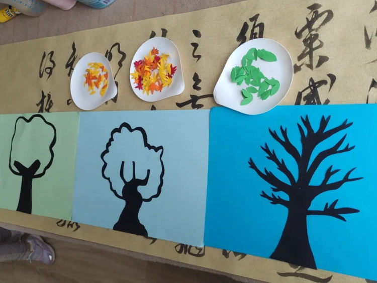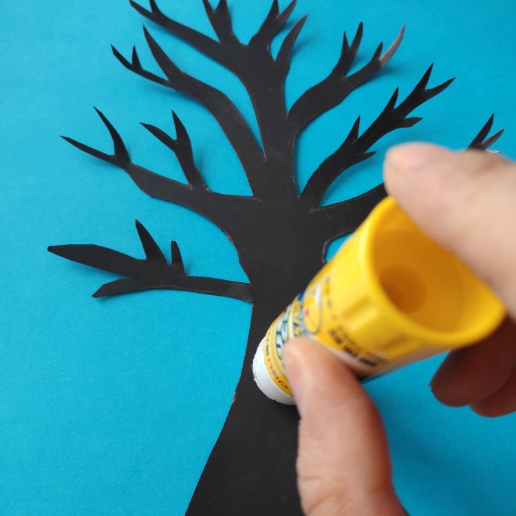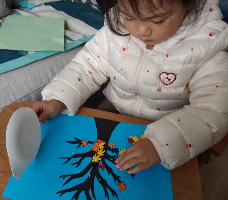 如果孩子动手能力强,我们就描述步骤;如果孩子需要协助,我们可以帮忙把彩纸剪成叶子,用黑色或者咖啡色剪出树干。