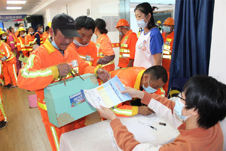 工作人员为环卫工人送上”体育关爱包“。
