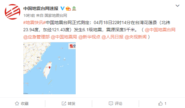 中国地震台网正式测定:04月18日22时14分在台湾花莲县(北纬23.94度,东经121.43度)发生6.1级地震,震源深度5千米。