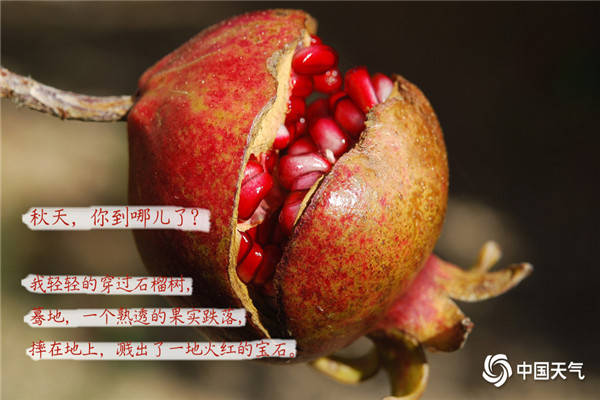 “秋天,你到哪里了?”“我轻轻的穿过石榴树,蓦地,一个熟透的果实跌落,摔在地上,溅出了一地火红的宝石。”