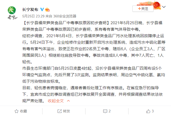 2021年5月25日晚,长宁县福荣笋类食品厂中毒事故原因已初步查明,系有毒有害气体导致中毒。