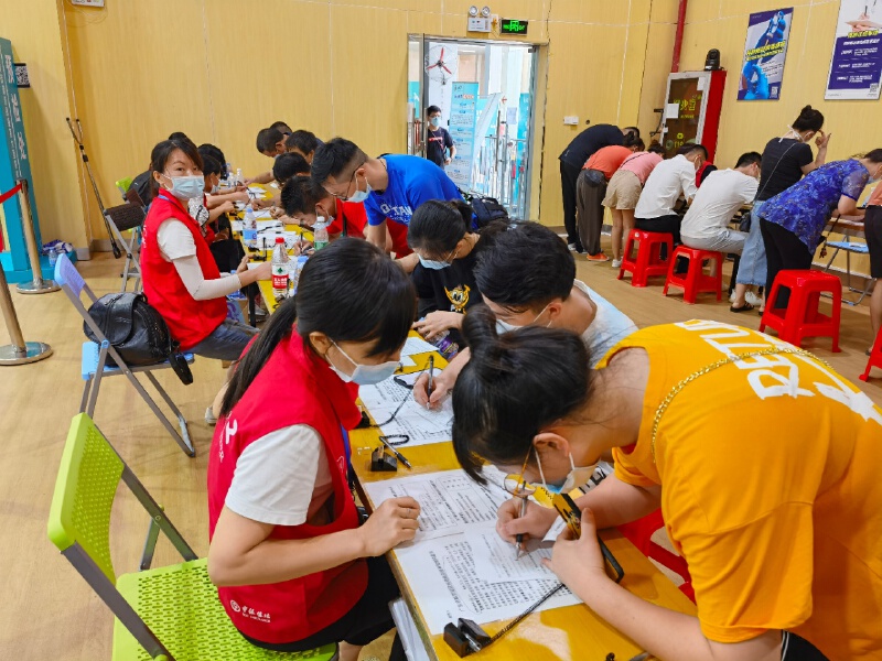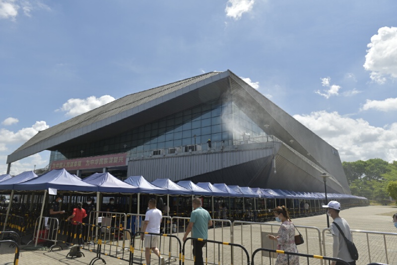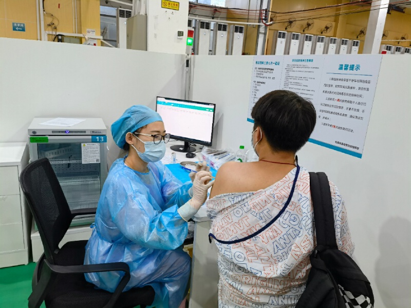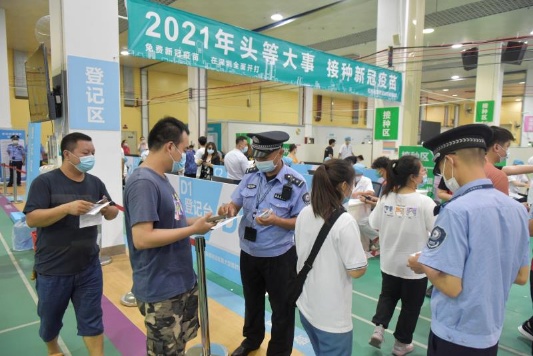 该接种点的接种区设在体育馆内,从外围100多米就开始设检查卡,市民在第一道卡出示相应时段接种预约码可进入,第二道卡是检查行程码,第三道卡是发放接种编号,然后通过人流数量控制卡,再经过安检门才能进入接种区。在接种区有工作人员指导填写个人相关接种信息卡片,再拿着卡片到与接种编号对应的接种卡位接种疫苗,接种结束后在留观区观察半小时,无异常即可离开。