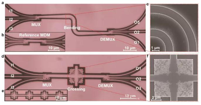 基于 “二维码”结构的片上弯曲波导和交叉器件。(a) 三模式复用和弯曲结构的显微镜照片; (b) 模式复用和解复用器件的显微镜照片; (c) 具有亚波长超结构的弯曲波导SEM照片; (d) 三模式复用和交叉结构的显微镜照片; (e) 级联的波导交叉器件显微镜照片; (f) 具有亚波长超结构的波导交叉器件SEM照片。