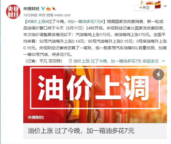 根据国家发改委消息,新一轮成品油调价窗口将于今天(6月11日)24时开启。央视财经记者从国家发改委获悉,本次油价调整具体情况如下:汽油每吨上涨175元,柴油每吨上涨170元。全国平均来看:92号汽油每升上涨0.14元;95号汽油每升上涨0.15元;0号柴油每升上涨0.15元。记者给您算了一笔账,按一般家用汽车油箱50L容量估测,加满一箱92号汽油,将多花7元。