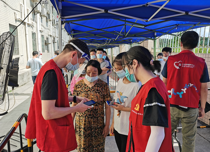 现场协助维护核酸检测秩序;引导市民有序排队;认真核查核酸检测人员信息;提醒出示健康码供工作人员扫描登记;指引老人、孕妇、儿童等特殊群体做好检测服务;为手机使用不便的居民填写信息……几天的时间里,百强会秘书处的几位员工始终穿梭在人群中,为社区居民提供指导和帮助,并全力配合现场医务人员,协助核酸检测工作有序开展。