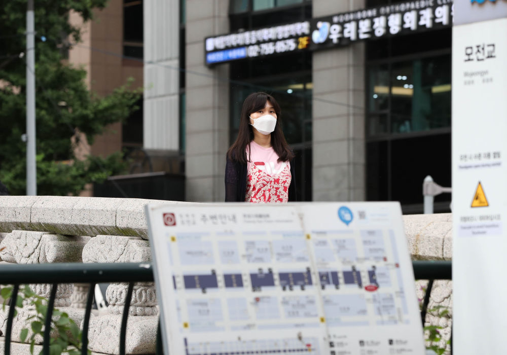 7月9日,戴口罩的行人走在韩国首尔清溪川附近的街道上。(新华社记者王婧嫱摄)