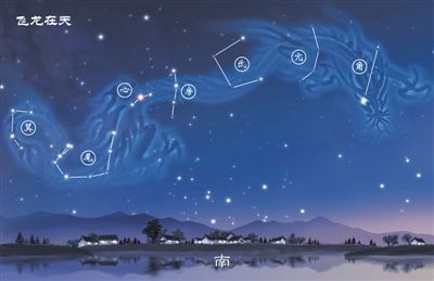 从角宿开始,自西南到南偏东的低空,苍龙七宿依次排开,组成一条腾飞的巨龙。角宿为龙角,亢宿为龙颈,氐宿、房宿为龙身,心宿为龙心,尾宿为龙尾。其中心宿就是现代天蝎座的心脏附近,最醒目的天体是红色的亮星心宿二。尾宿是天蝎座的尾巴部分,呈弯钩状,是二十八宿中最靠南的一宿。