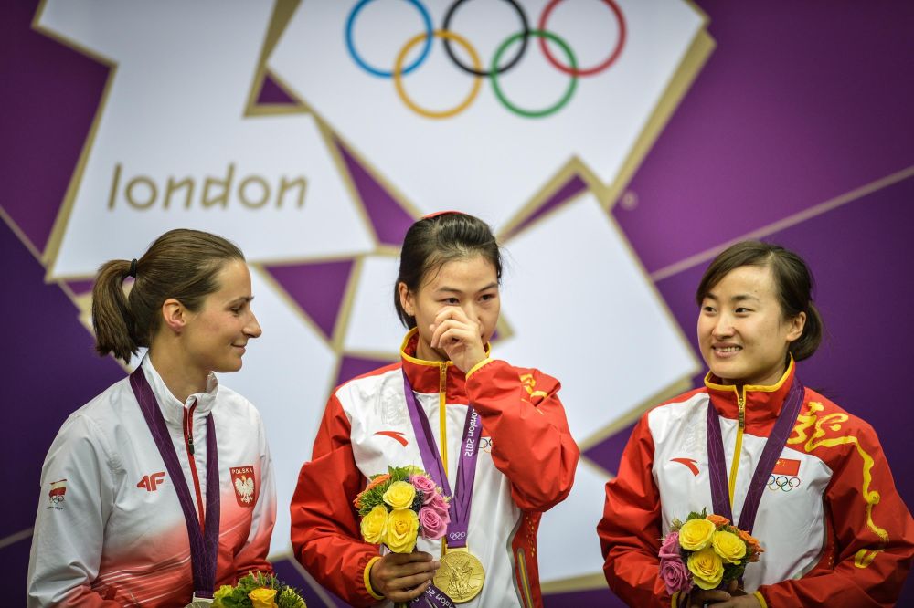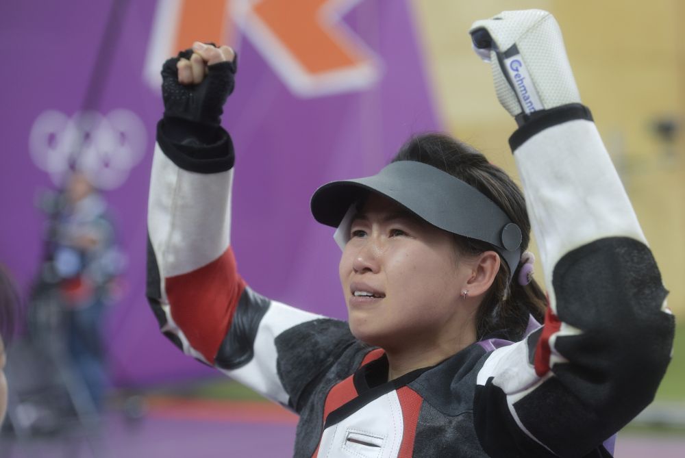 (易思玲夺得伦敦奥运会首金后庆祝)