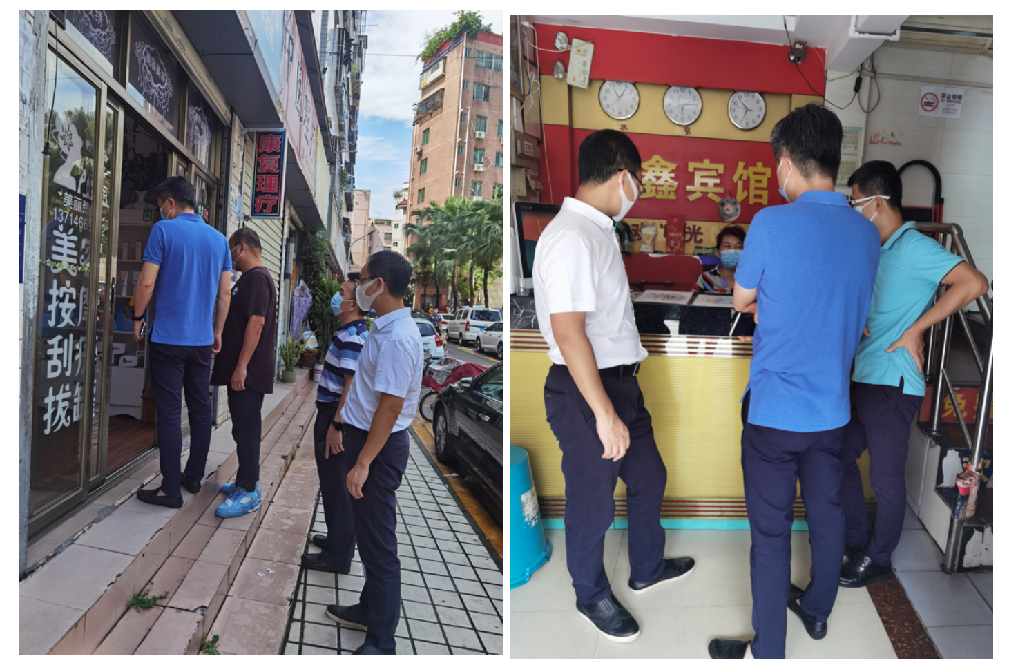 8月11日上午,清水河街道党工委委员戴雁、草埔西社区第一书记吴剑霖,在社区党委书记邓新锋、副站长游海康的陪同下,对草埔西社区的疫情防控工作进行巡查。