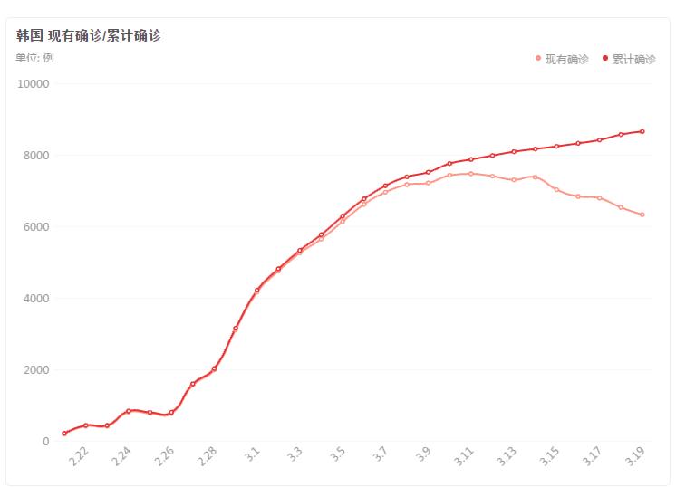 截至3月20日0时,韩国当日新增新型冠状病毒感染的肺炎确诊患者87例,累计确诊8652例,正在检查中人数15525人,治愈人数2233人,死亡人数94人,病死率约为1.1%。自2月下旬疫情出现爆发式增长以来,3月9日确诊病例数首次少于200例,之后便出现日渐下降的趋势,韩国疫情蔓延速度明显放缓并得到有效控制。