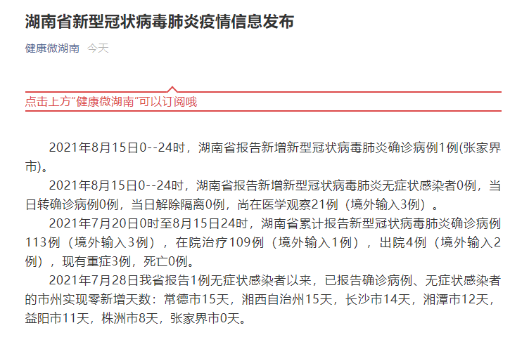 2021年8月15日0--24时,湖南省报告新增新型冠状病毒肺炎确诊病例1例(张家界市)。