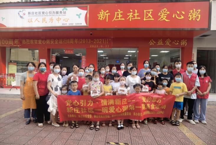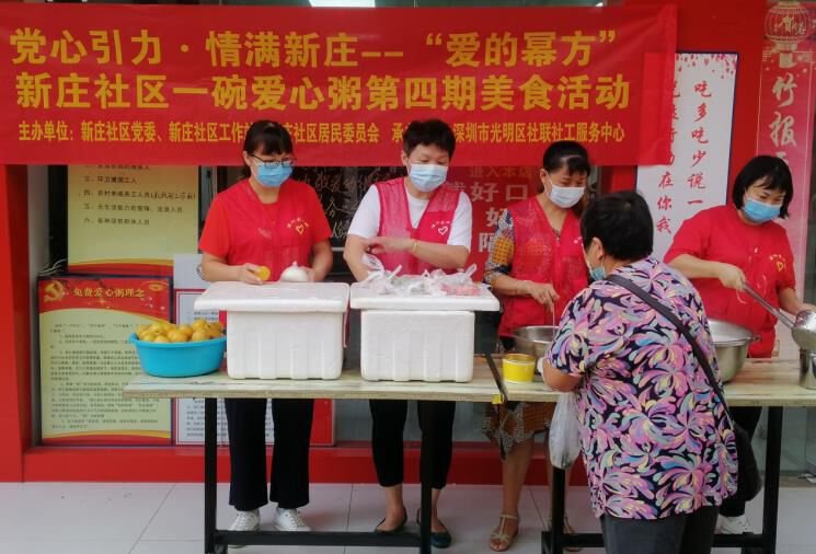 光明区新庄社区“一碗爱心粥”项目是一个为辖区内的环卫工、孤寡老人、留守儿童以及流浪乞讨人员等人群免费提供爱心早餐的暖心服务。自2017年10月28日由爱心企业创立,获新庄社区党委、工作站大力支持,至今有8年时间。实现了志愿者自主运营管理,至今“爱心粥”项目总就餐96474人次,发放总馒头数114572个,总志愿者人数达9740人次。