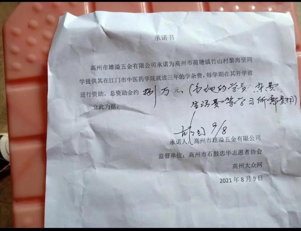 经媒体报道后,好消息传来!茂名高州一家企业承诺为黎海坚提供大学全程学杂费、生活费,总资助金约8万元。