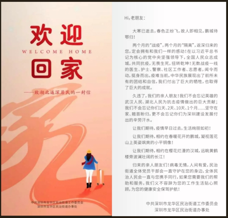 民治街道为迎接陆续返深的湖北老乡们,准备了一份特殊“礼物”——一封《欢迎回家》的信。