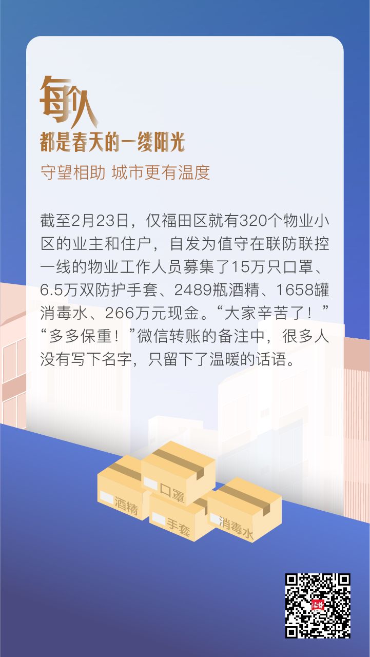 截至2月23日,仅福田区就有320个物业小区的业主和住户,自发为值守在联防联控一线的物业工作人员募集了15万只口罩、6.5万双防护手套、2489瓶酒精、1658罐消毒水、266万元现金。“大家辛苦了!”“多多保重!”微信转账的备注中,很多人没有写下名字,只留下了温暖的话语。
