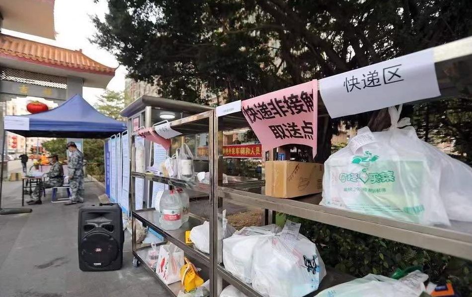 深圳一小区门口“无接触配送”快递、外卖取送点。