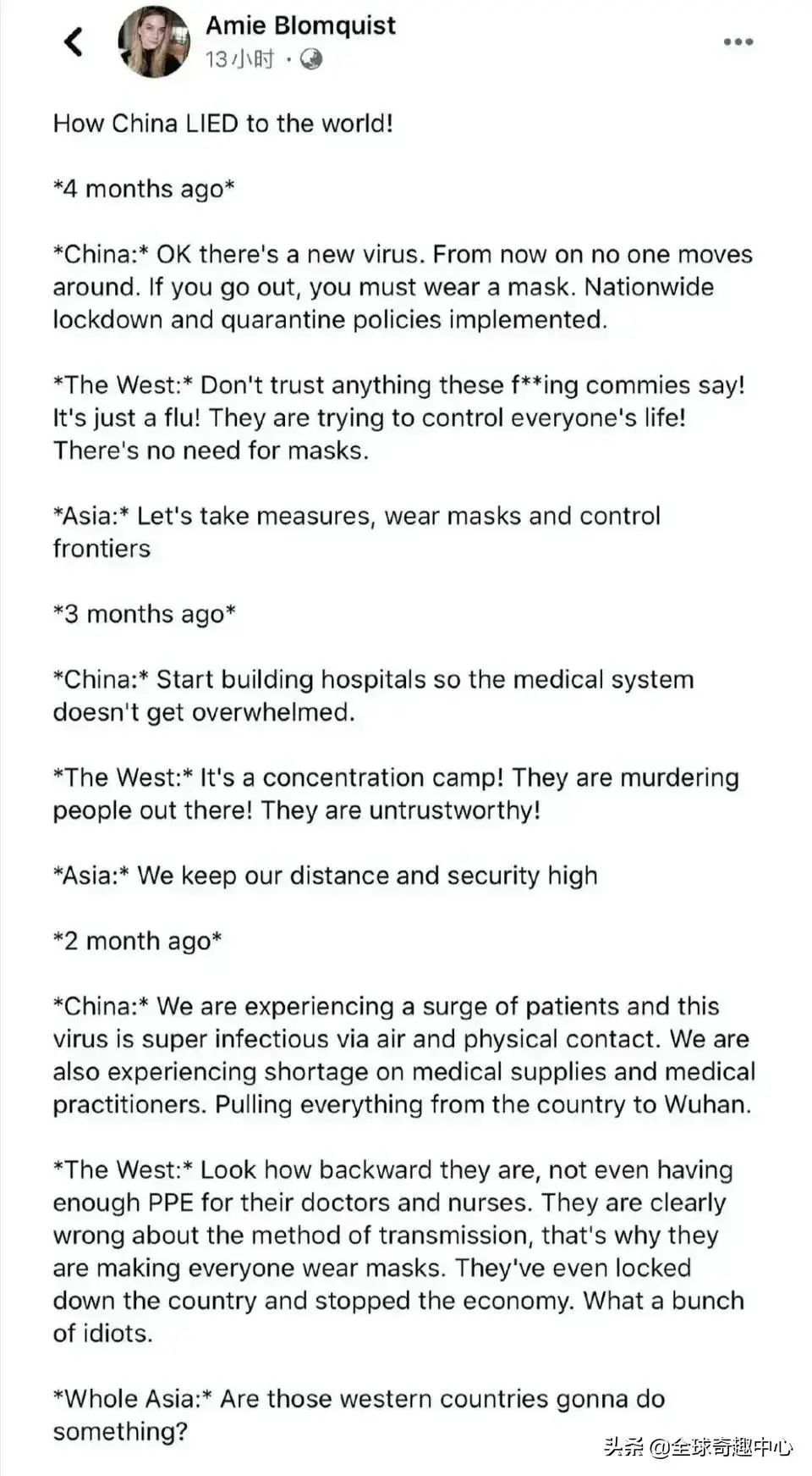 “这精确地总结了所有的崩溃。西方世界收到了警告。我也试图劝人们戴口罩,但我被嘲笑了。现在他们明白了,但不愿意承担责任。我已经看到许多无视警告的国家领导人如今隐瞒数据。”