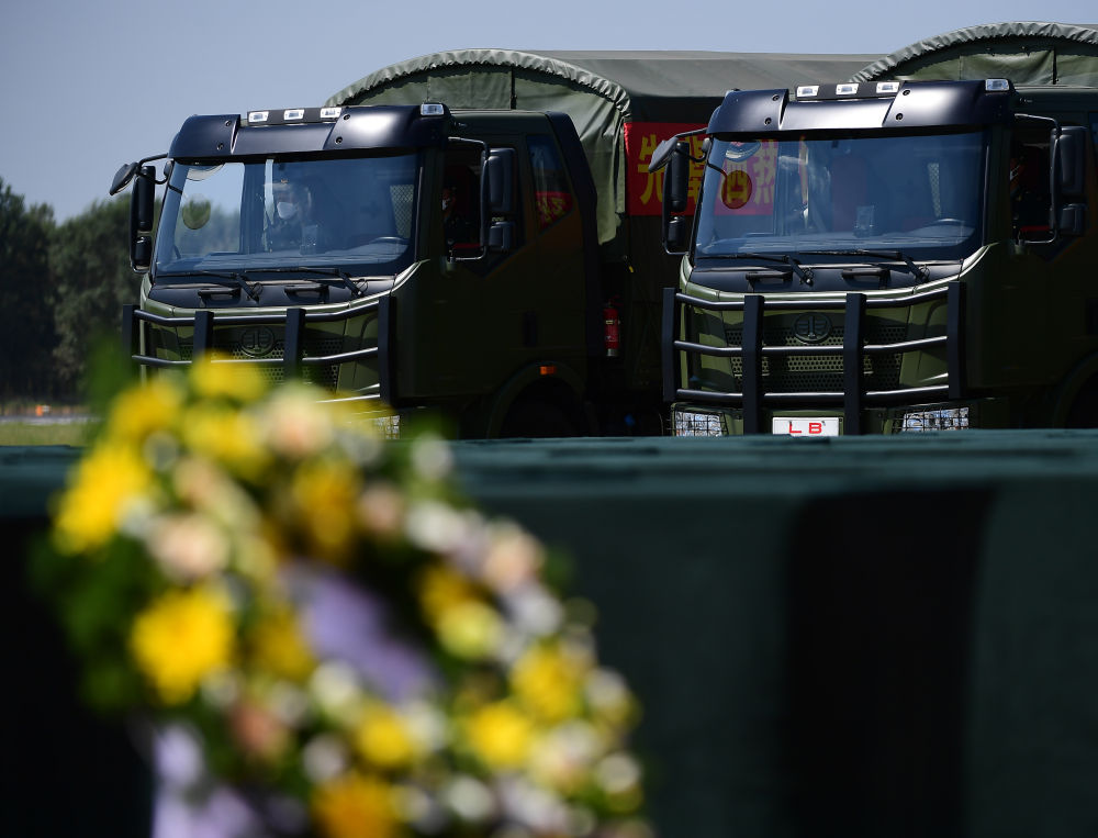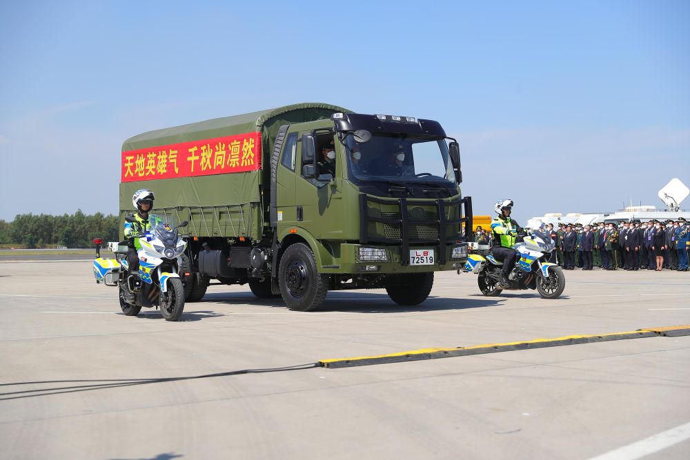 ↑9月2日,载有志愿军烈士遗骸的军用车辆离开沈阳桃仙国际机场。