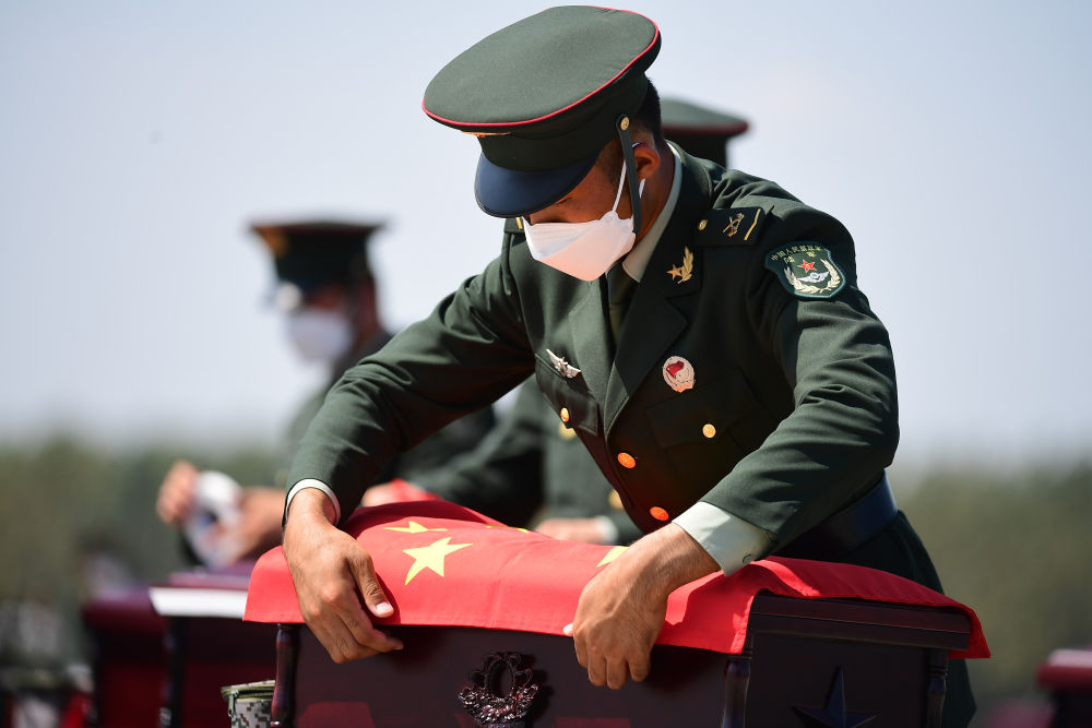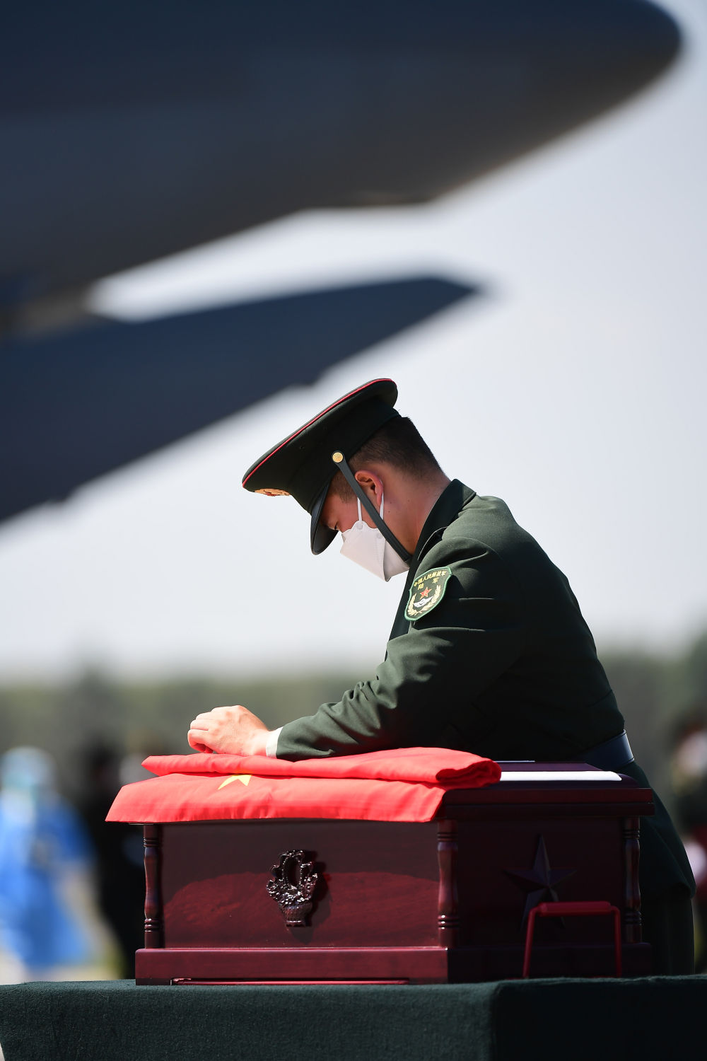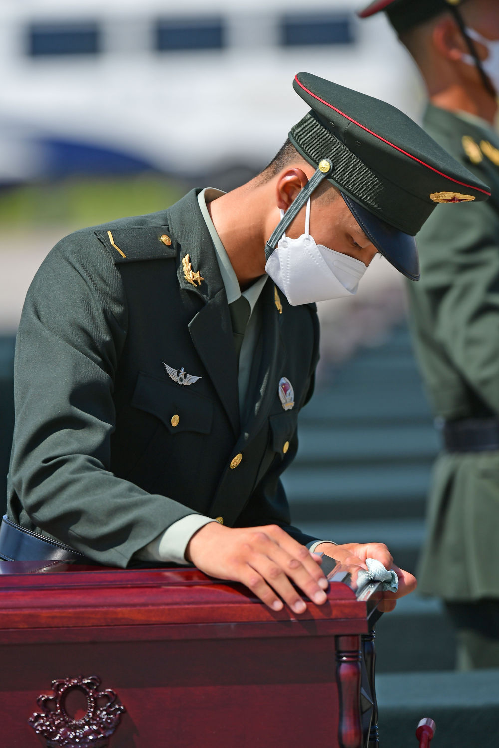 ↑9月2日,在沈阳桃仙国际机场,礼兵在殓放志愿军烈士遗骸的棺椁上覆盖国旗。
