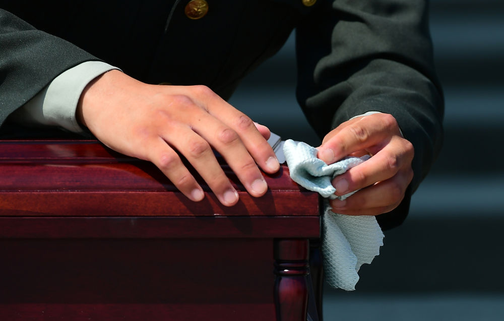 ↑9月2日,礼兵在擦拭烈士遗骸棺椁。