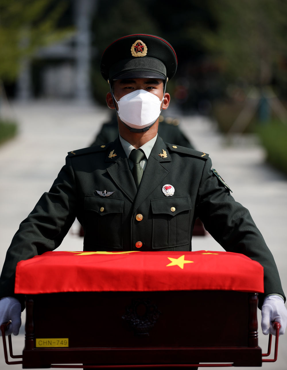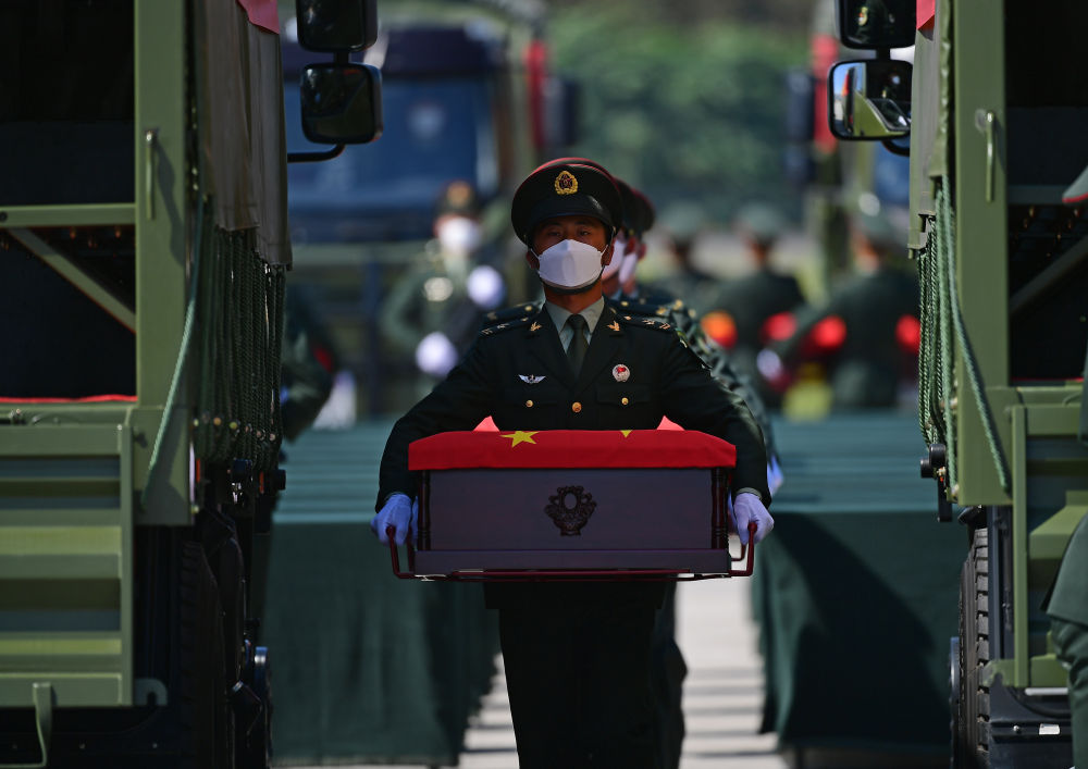 ↑9月2日,礼兵将殓放志愿军烈士遗骸的棺椁护送至运送车辆。