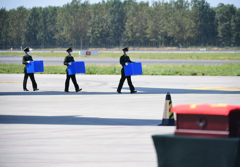 ↑9月2日,在沈阳桃仙国际机场,礼兵将志愿军烈士遗物从专机上护送至运送车辆。