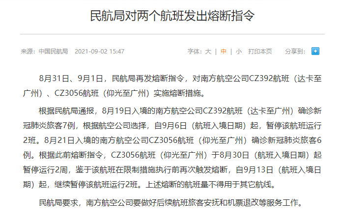 根据民航局通报,8月19日入境的南方航空公司CZ392航班(达卡至广州)确诊新冠肺炎旅客7例,根据航空公司选择,自9月6日(航班入境日期)起,暂停该航班运行2班。8月21日入境的南方航空公司CZ3056航班(仰光至广州)确诊新冠肺炎旅客6例。根据此前熔断指令,CZ3056航班(仰光至广州)于8月30日(航班入境日期)起暂停运行2周,鉴于该航班在限制措施执行前再次触发熔断,自9月13日(航班入境日期)起,继续暂停该航班运行2班。上述熔断的航班量不得用于其它航线。