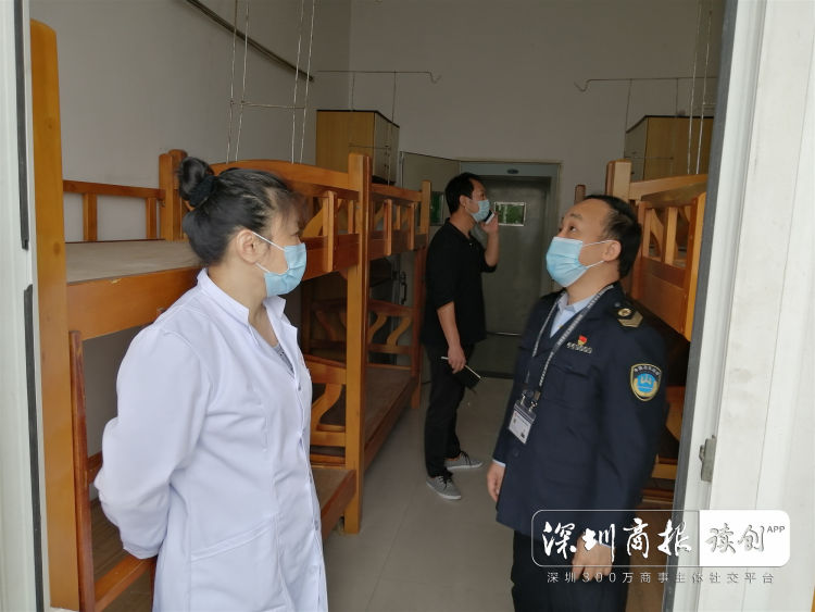 ▲执法员对深圳市育新学校学生宿舍卫生情况进行现场检查。