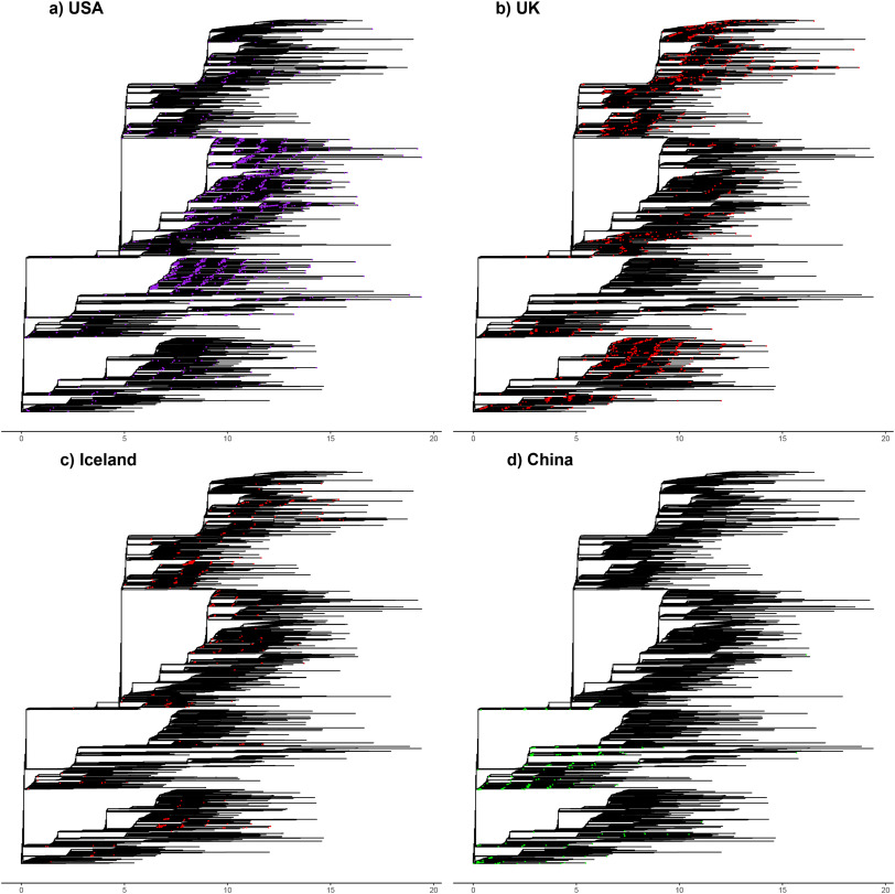 事实上,英国、美国、冰岛、澳大利亚等大多数国家中发现的SARS-CoV-2基因组多样性基本概括了7666个基因组数据集中COVID-19的全球多样性。