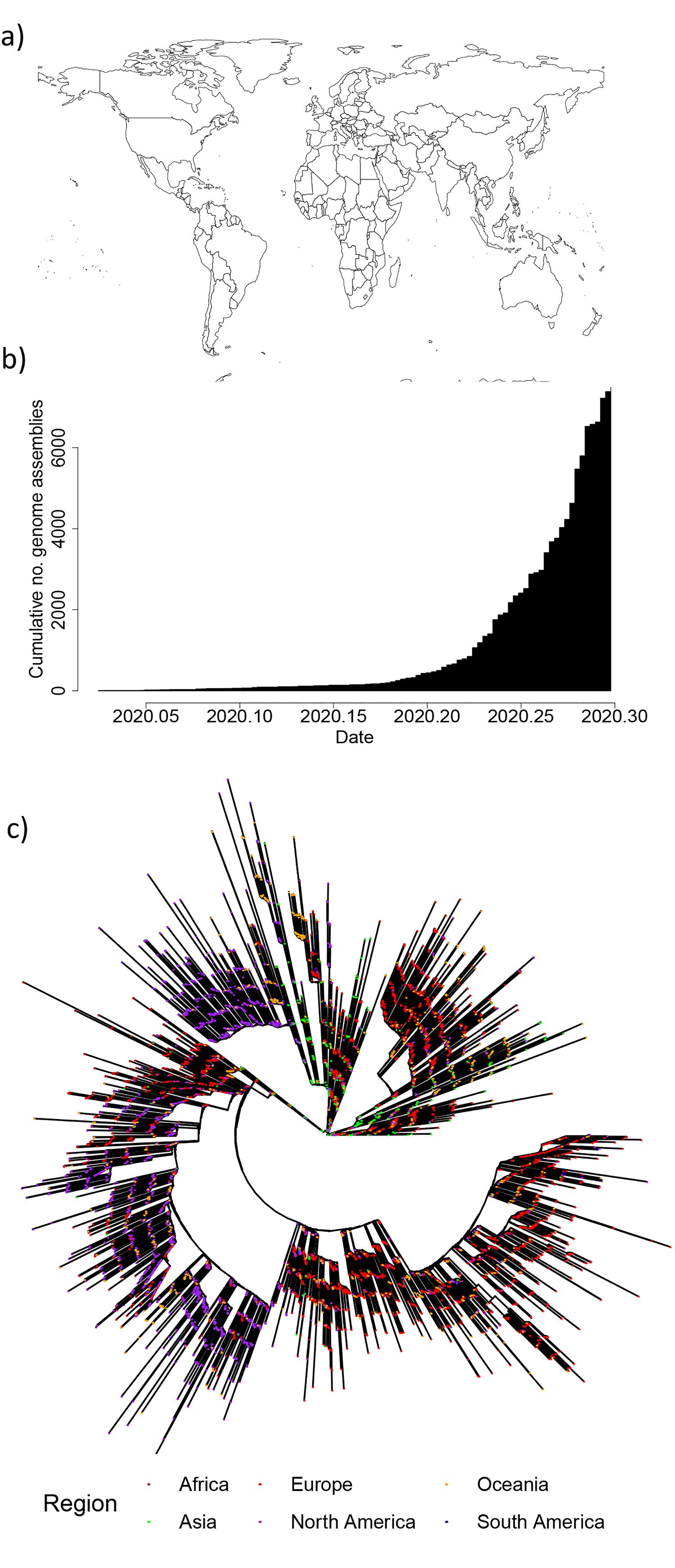 这7666个 SARS-CoV-2基因组对COVID-19大流行进行了极好的地理和时间覆盖,研究人员将基因组数据的采集时间与其进化过程之间的关系用遗传进化树表达,并进而制作了放射状图和线性布局图。