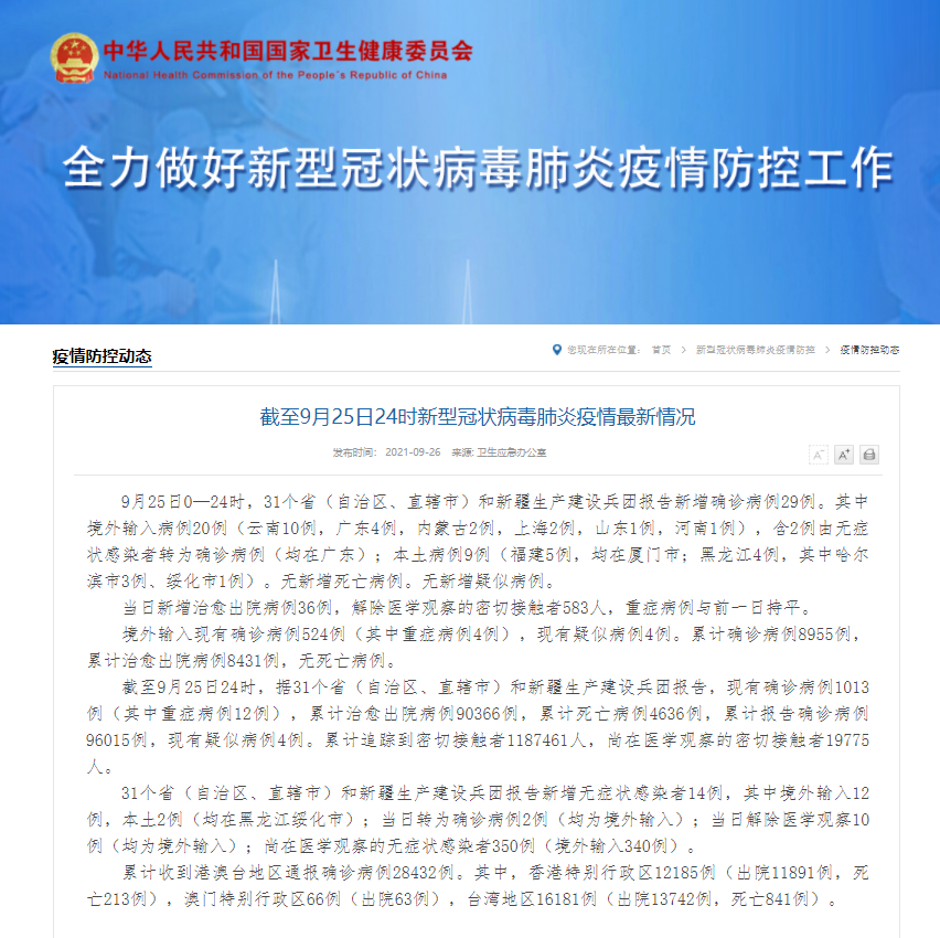截至9月25日24时新型冠状病毒肺炎疫情最新情况