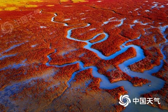 2018年10月23日,辽宁盘锦,红海滩秋色迷人。(图片来源:视觉中国/版权图片)