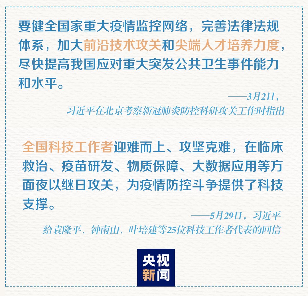 5月8日,中共中央在中南海召开党外人士座谈会。习近平在座谈会中肯定“武汉保卫战、湖北保卫战取得决定性成果,疫情防控阻击战取得重大战略成果”的同时,还提到:“不到一周时间就确定了新冠病毒的全基因组序列并分离得到病毒毒株,及时推出多种检测试剂产品,迅速筛选了一批有效药物和治疗方案,多条技术路线的疫苗研发进入临床试验阶段”,这些都在“紧紧依靠科技进步”中取得。