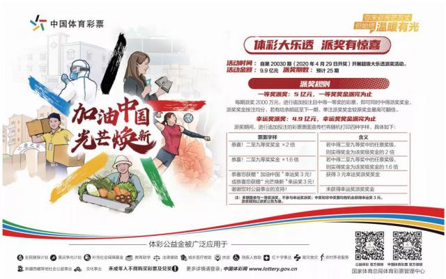 4 月 27 日,体彩大乐透开启史上最大规模派奖活动—— 9.9 亿元大派奖。活动针对大乐透独有的"追加投注"方式展开,所有奖级都有派奖,3 元最高可中 3600 万元。追加投注在大乐透各种投注方法中享有独特优势,参与一、二等奖奖金分配,奖金的分配比例为基本投注奖金的 80%:每注多投入 1 元,一、二等奖就可多拿 80% 奖金。
