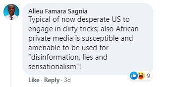 冈比亚网友Alieu Famara Sagnia:“这是美国绝望之中使用阴招的典型。非洲私营媒体也容易被利用来散布‘虚假信息、谎言和煽动’。”