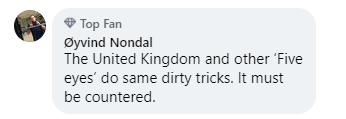 挪威网友Oyvind Nondal:“英国和其他‘五眼联盟’成员也使用同样的阴招。必须予以还击。”