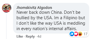 菲律宾网友Jhomskivitz Algodon:“中国绝不要退让,不要被美国所欺凌。我是一个菲律宾人,我不喜欢美国干涉每个国家内政的样子。”