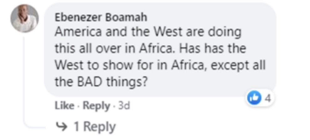 网友Ebenezer Boamah:“美国和西方国家在非洲各地都这么做,除了做坏事,西方国家还在非洲做了什么?”