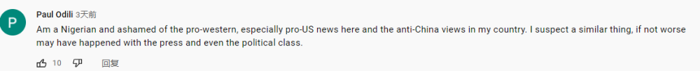 尼日利亚网友Paul Odili:“我对尼日利亚那些亲西方、尤其是亲美的新闻以及反华的观点感到羞耻。我怀疑‘类似的事情’可能也发生在尼日利亚。”