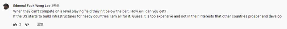 网友Edmond Fook Weng Lee:“当美国无法在公平竞争中取胜时,就会使出‘下三滥’的招数。如果美国为有需要的国家建设基础设施,我完全赞成。不过,让其他国家实现发展和繁荣‘太昂贵’,不符合美国的利益。”