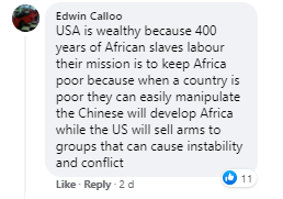 网友Edwin Calloo:“美国很富有,因为享受了400年对非洲奴隶的奴役。他们的任务是让非洲保持贫穷,因为当一个国家贫穷时,他们就可以轻松操纵。中国想要让非洲实现发展,而美国只会向那些可能引发不稳定和冲突的人出售武器。”