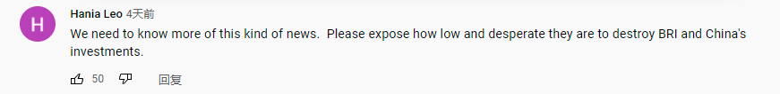 网友Hania Leo:“我们需要知道更多这样的新闻。请揭露他们为了破坏‘一带一路’和中国投资是多么的卑劣和丧心病狂。”