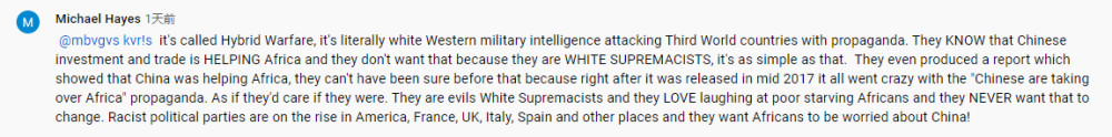 网友Michael Hayes:“西方国家知道中国的投资和贸易正在帮助非洲,但他们不希望这样,因为他们是白人至上主义者。他们曾制作了一份报告,显示中国正在帮助非洲,但在他们发现中非合作进一步加深之时,‘中国正在接管非洲’的宣传就变得疯狂起来。归根结底,西方人喜欢嘲笑贫困的非洲人,他们从不希望这种情况改变。”